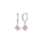 Silberne Kreole mit Schmetterling, die mit gelber, rosa, rosa, grüner und hellblauer Emaille hängt.