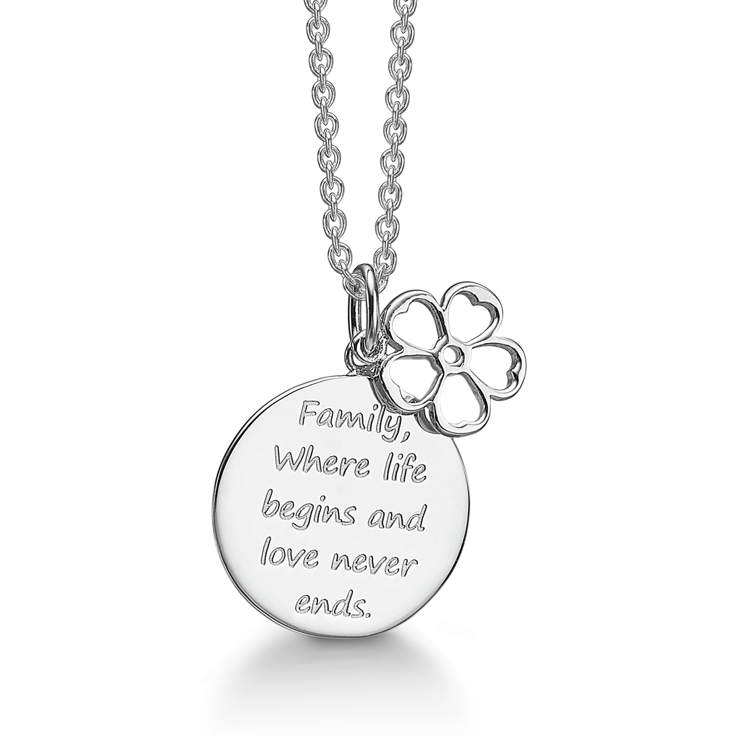 Silberhalskette rhodiniert Aussage „Familie, wo das Leben beginnt und die Liebe niemals endet“