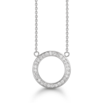 Silberkette rhodinierter Kreis mit facettiertem Zirkonia am Rand. Die Kette ist 42,5 cm lang.
